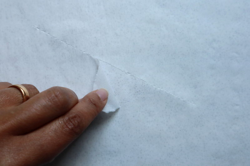 Taking the other fabric, remove the fusible webbing revealing the gluey side and iron onto a section of interfacing, which is larger than the fabric…