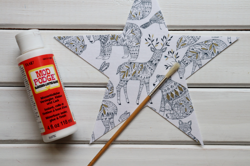 If you would like your stars to be stiffer, for example, if you are using them as shelf decorations, paint on a layer of découpage glue to each side, allowing them to dry in between coats. Please note that découpage glue can make the colours on some fabrics run, so I would advise testing it out on a small piece of the fabric first.