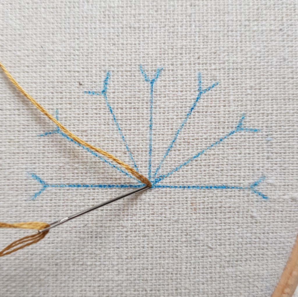 Use 3 strands of 6 stranded cotton embroidery floss throughout. Cut about an arm’s length of thread and split the 6 strands in half each time, so that the stitches are made using 3 strands of thread.
