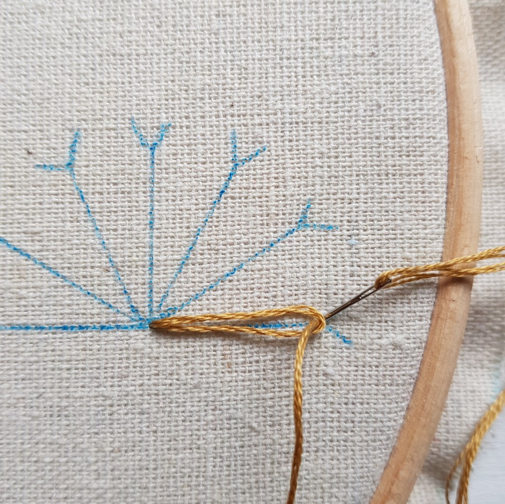 Make the next stitch in the same way, bringing the needle back up from WS to RS at the next point and then RS to WS at the same point, leaving a loop. Catch this loop with the needle as you place it WS to RS again. Finish the stitch by taking the needle back from RS to WS on the other side of the loop. Continue until the long stitches of the main seed head are complete.