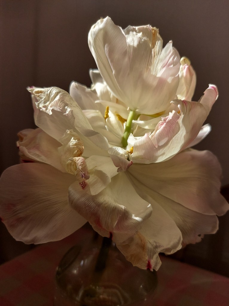 As I am writing this, the sun is shining, the garden is bursting with promise and the light coming through the little window is illuminating the voluminous, creamy pink-streaked tulip I picked from my garden last week. The tulip is dying but there is beauty in decay. There is also a tree surgeon two gardens down making a hell of a noise pollarding the neighbour’s plane trees. There will be more light for us as a result so I am trying to be calm about it. I am seeing it as a metaphor. I am that tree surgeon, albeit not as shouty! I am pollarding to let go of/cut off (the latter sounds too brutal and angry but perhaps this is actually more accurate) anything – activities, actions, beliefs, people, foods – that aren’t good for me and in doing so I am allowing more light in. I am getting rid of toxicity and making space for what is warm and kind. I wrote about the importance of light in my last blog post, which you can read here.