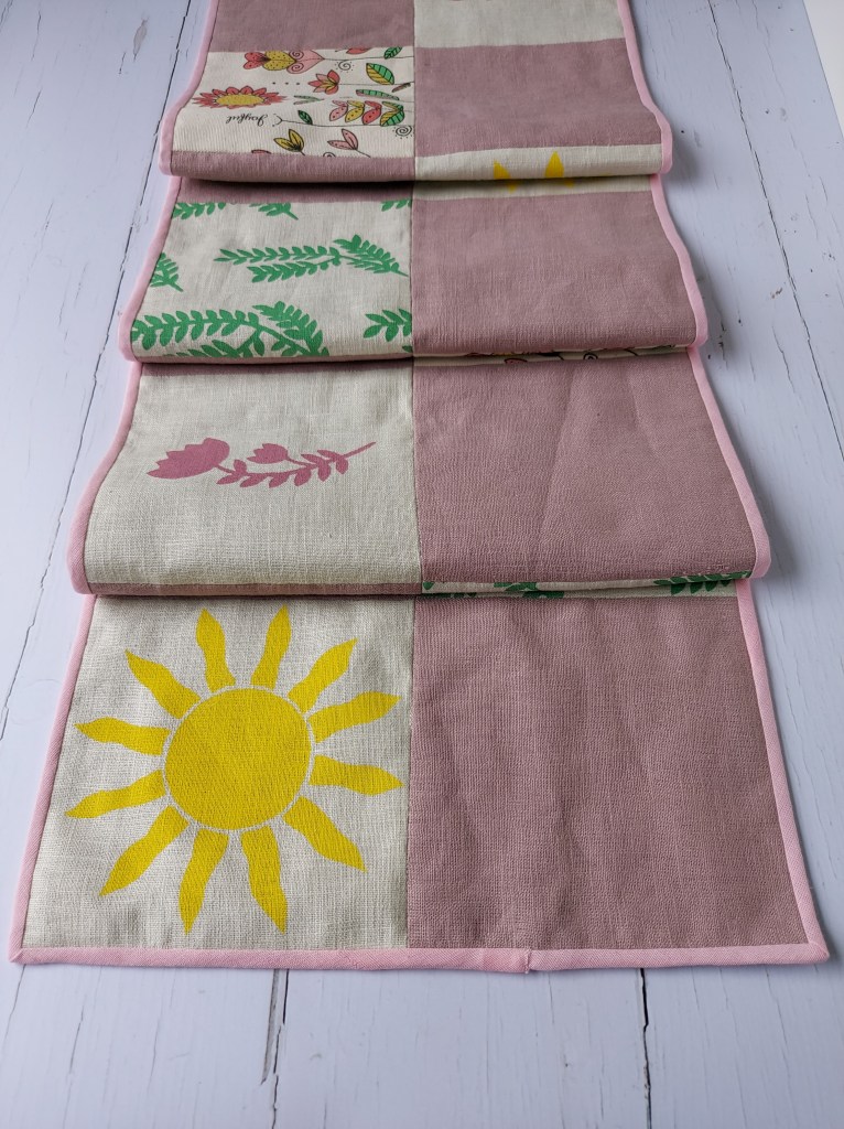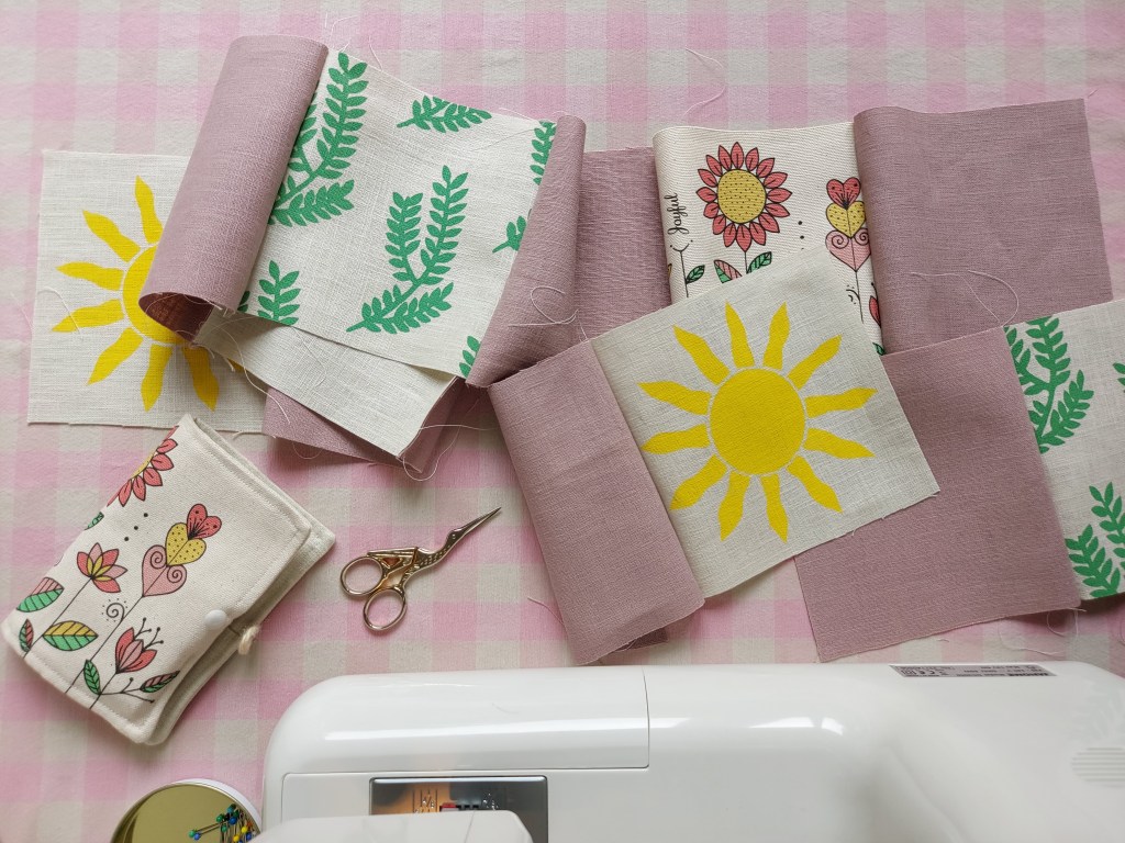 Cut out any further squares of additional fabric you wish, using either the sunshine or the words stencil for the square measurement as above. I used ‘joyful flora’ fabric I had printed last year to create 2 more patterned squares and a dusky pink linen fabric to create 8 plain squares.