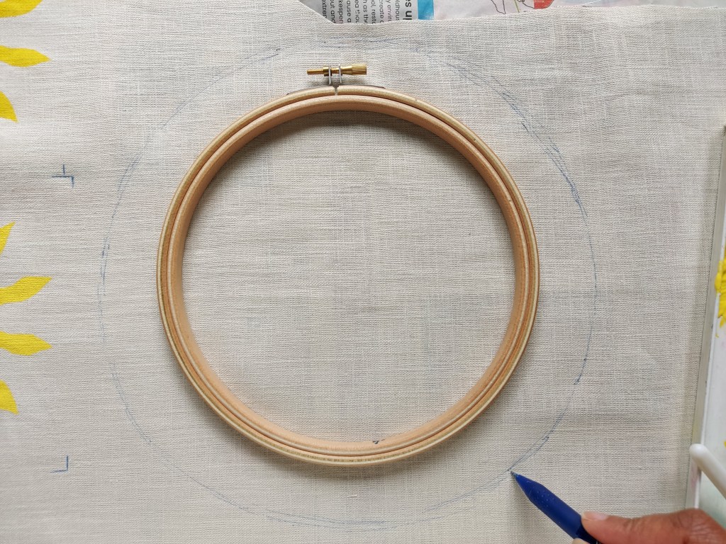 Use the inner hoop of a 7inch embroidery hoop to create a circle on your fabric using a heat erasable fabric marker. Also mark approximately 2.5-3cm from the outer hoop to create another circle.