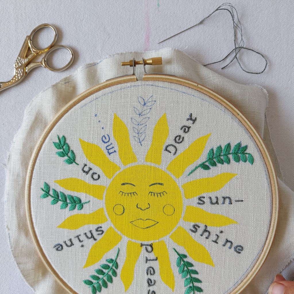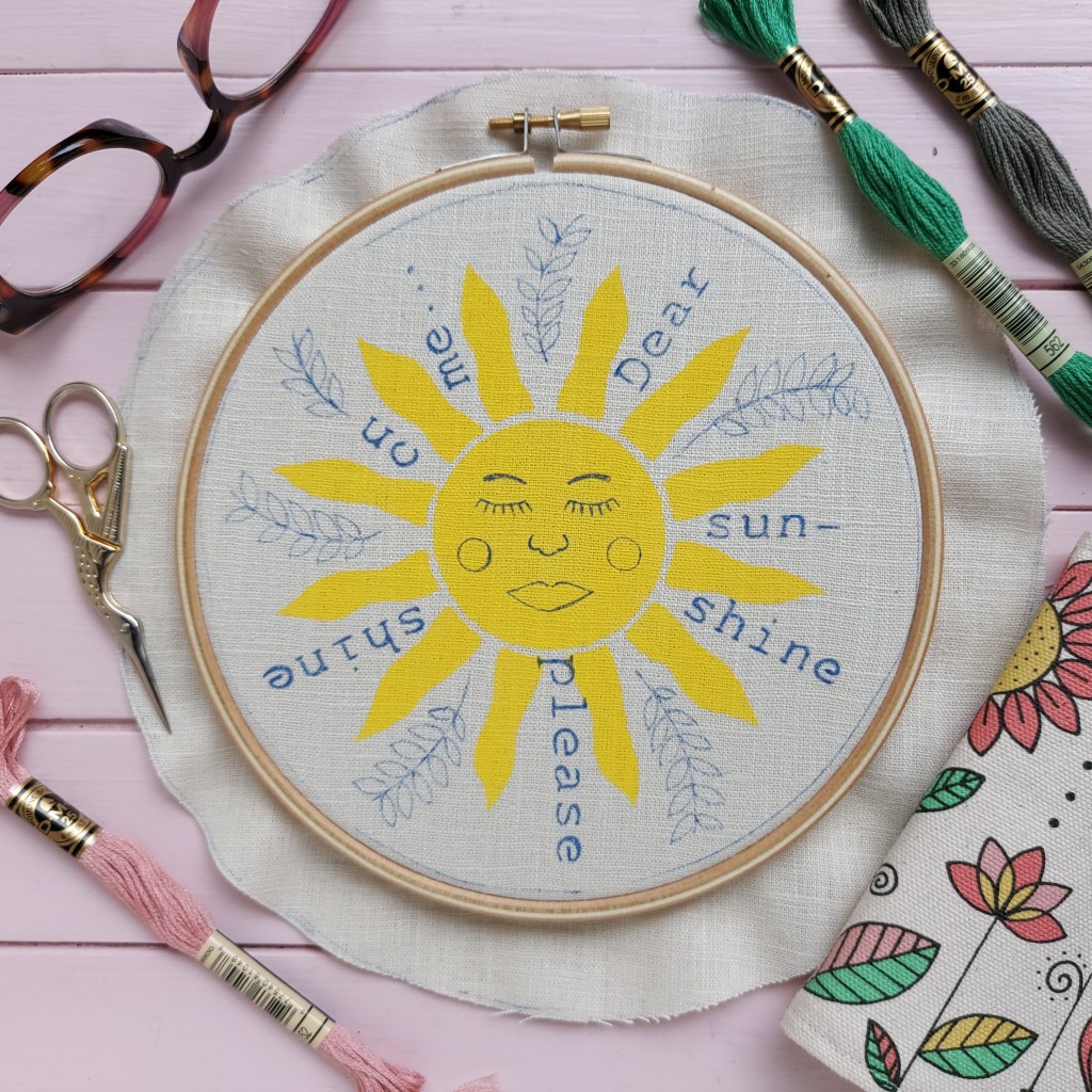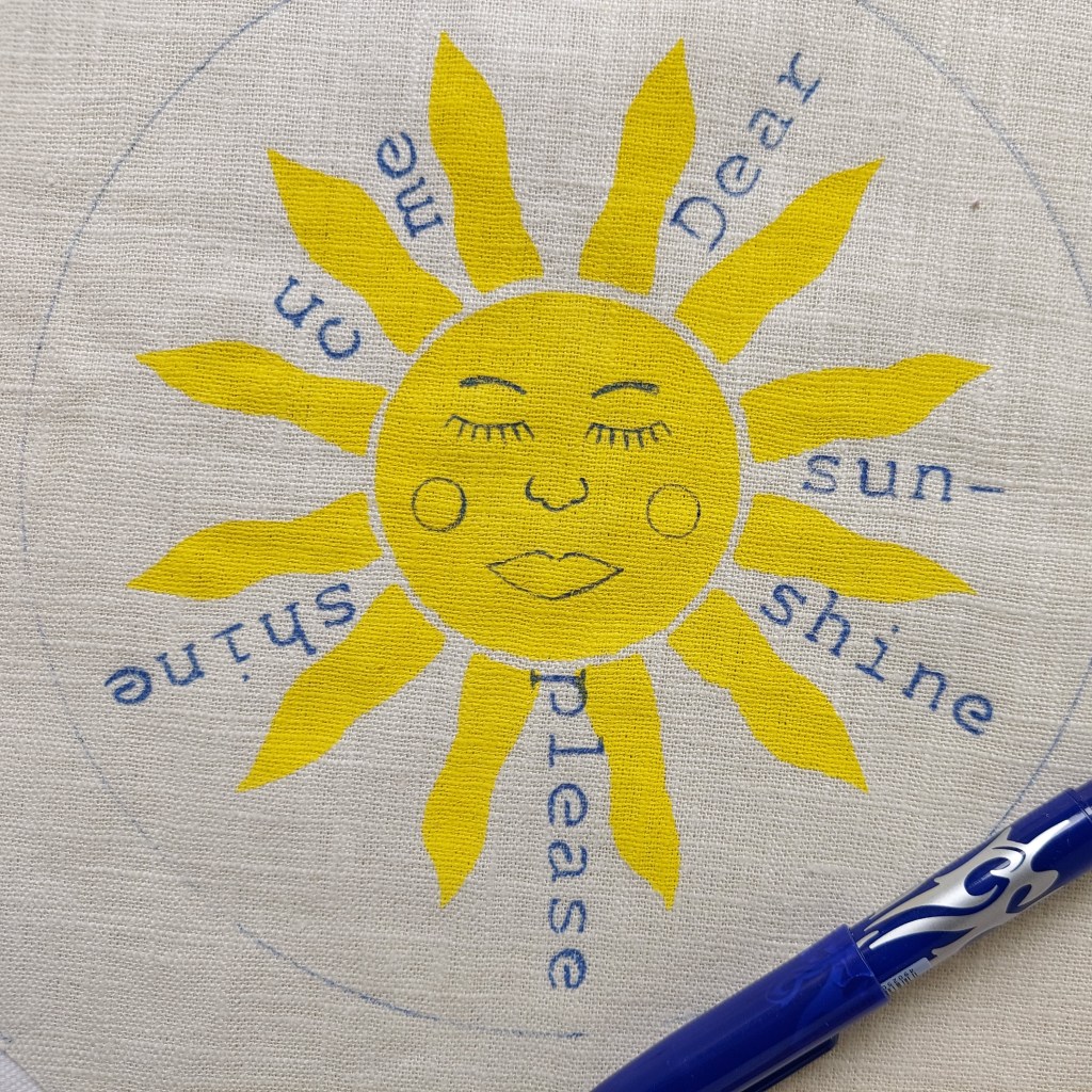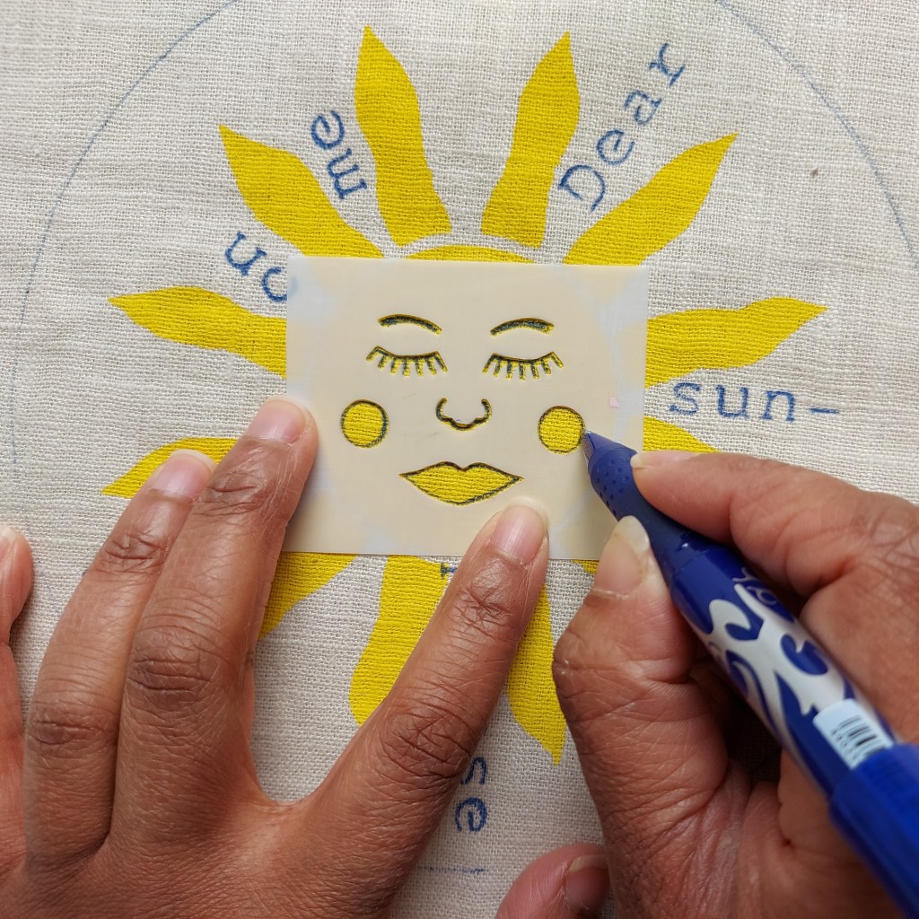 Once dry, add your chosen words and the sunshine face using the ‘shine’ words, face stencils and a heat erasable fabric pen.