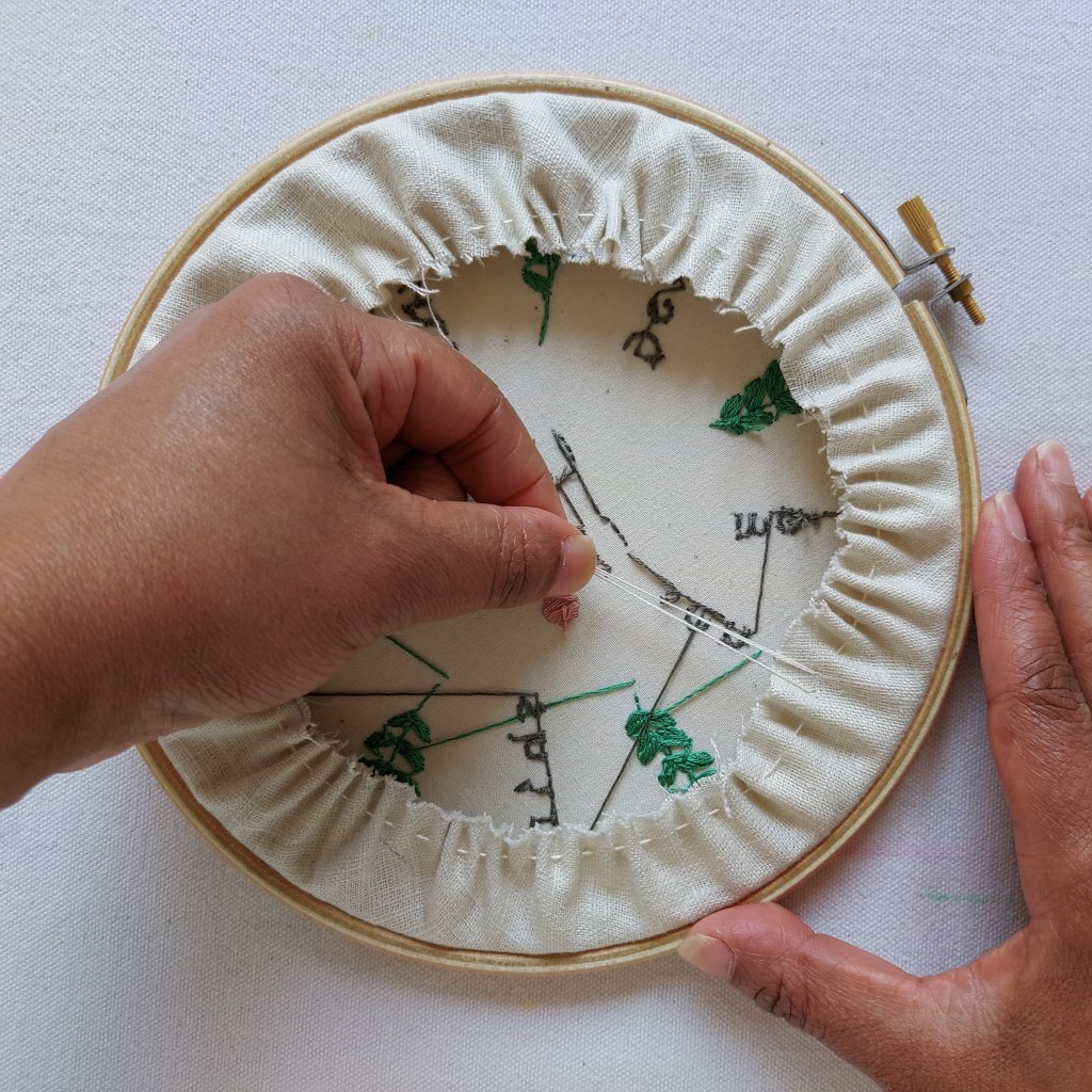 Now you can enjoy the stitching! I used whipped back stitch for the letters, the tops of the eyelashes and the nose; french knots for the 3 dots after the word ‘me’; stem stitch for the botanical central stems and the eyebrows; straight stitch for the eyelashes and satin stitch for the leaves, the cheeks and the lips.