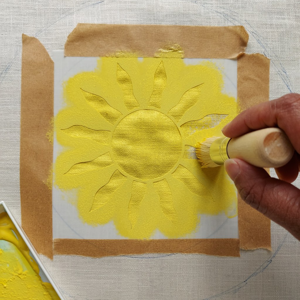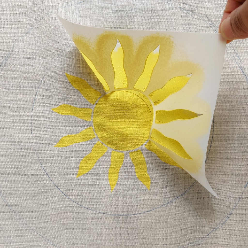 Spray adhesive (for more information on repositionable adhesive, please see part 1 of this post) to the back of the ‘shine’ sunshine stencil and stick onto the fabric within the inner circle. Place eco tape around the edges of the stencil to prevent the fabric around the stencil from becoming marked.