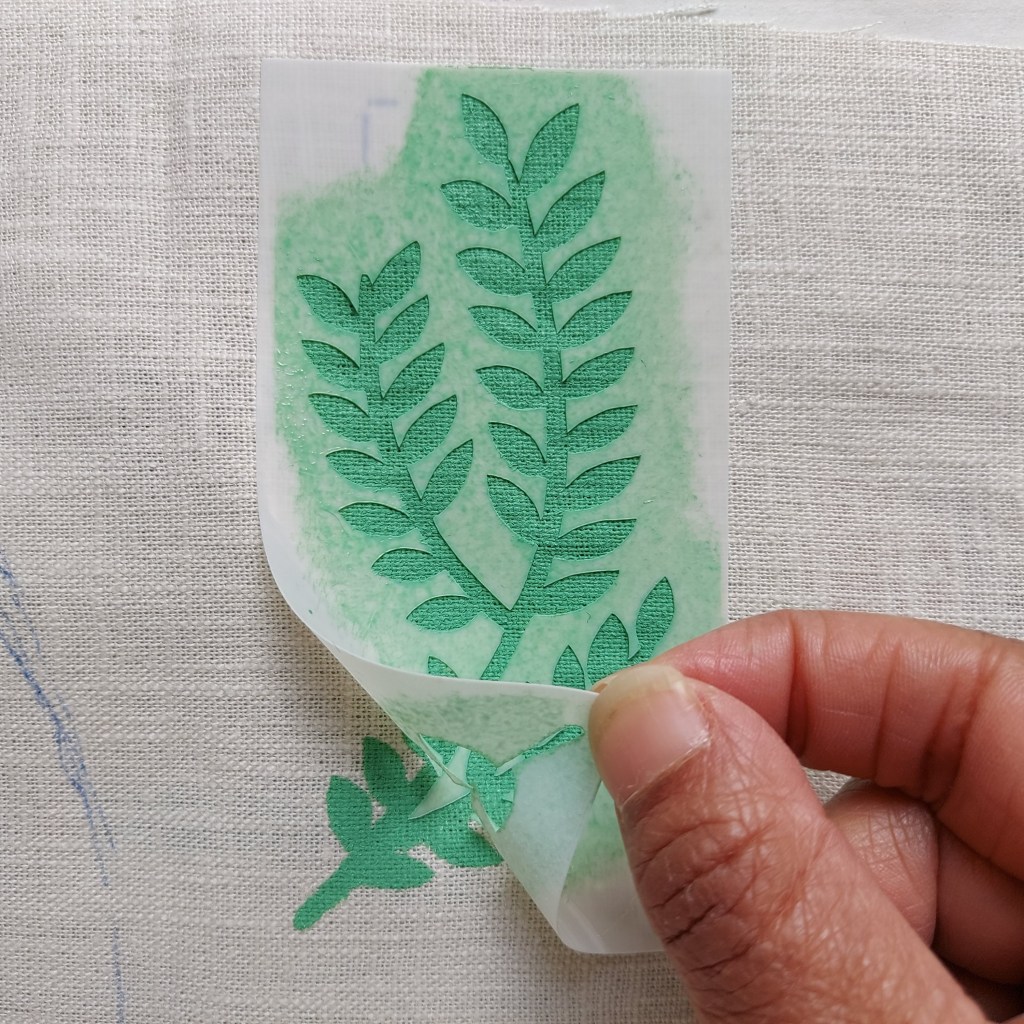 Carefully peel the stencil away from the fabric.